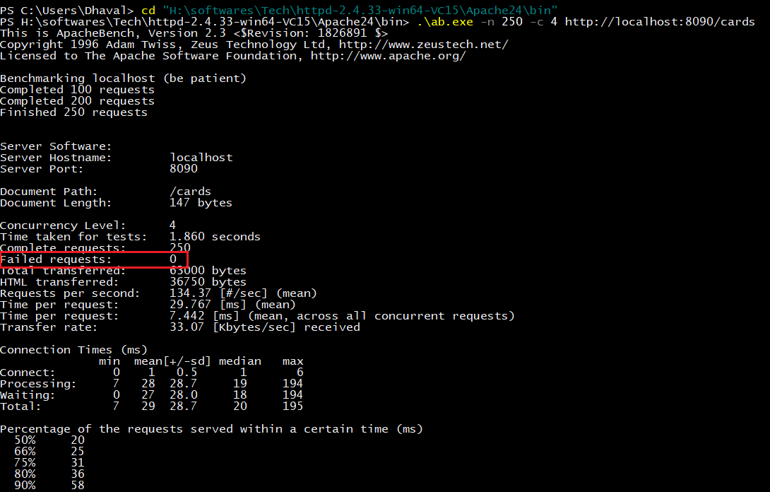 13}After running 250 requests with 4 concurrent threads for fetching all cards using Apache Bench